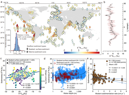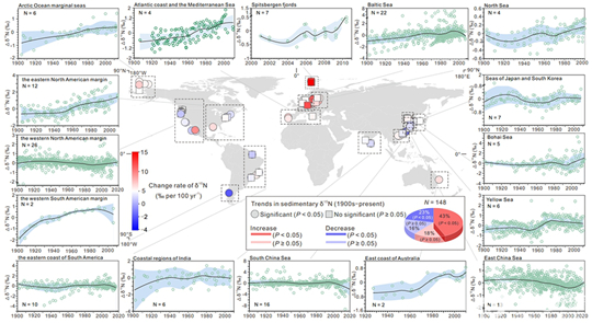 modern marine sediments”(現代海洋沉積物中氮同位素信號的全球模式與驅動因素)的最新研究成果,系統解析了現代海洋沉積物中氮同位素的時空演變特征,并指出在百年尺度上人類活動與氣候變化正以前所未有的強度重塑海洋氮循環格局。