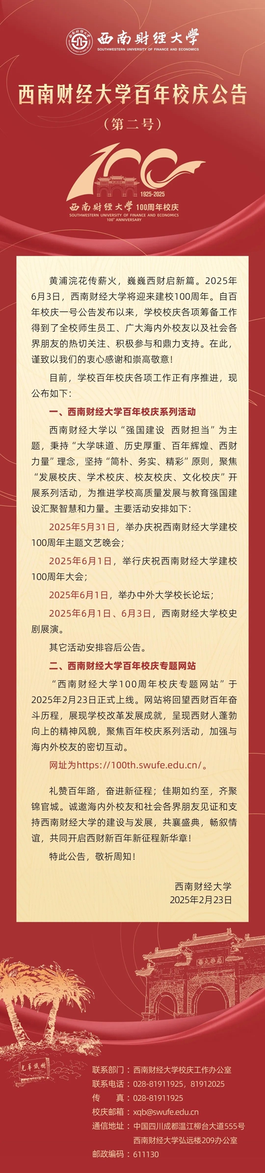 西南財經大學百年校慶公告(第二號)
