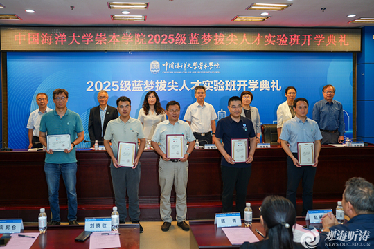 崇本學(xué)院院長高會旺在致辭中鼓勵同學(xué)們敢于擁抱不確定性,敢于挑戰(zhàn)不可預(yù)見的困難,努力成長為海洋領(lǐng)域領(lǐng)軍人才。崇本學(xué)院副院長趙棟梁宣讀了《關(guān)于選聘崇本學(xué)院2025級藍(lán)夢拔尖人才實(shí)驗(yàn)班班級導(dǎo)師、學(xué)業(yè)導(dǎo)師的決定》。與會領(lǐng)導(dǎo)為導(dǎo)師代表頒發(fā)聘書。