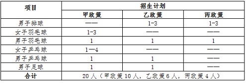 注:1.排球項(xiàng)目招收主攻、二傳、副攻及自由人位置,報(bào)名不分比賽位置。2.足球項(xiàng)目招收甲政策考生的比賽位置為中鋒,乙政策考生的比賽位置為邊前衛(wèi)。根據(jù)考生測試實(shí)際水平協(xié)調(diào)各位置招生計(jì)劃、確定簽約人數(shù)。3.甲、乙、丙政策詳見本簡章“四、簽約及錄取”部分。