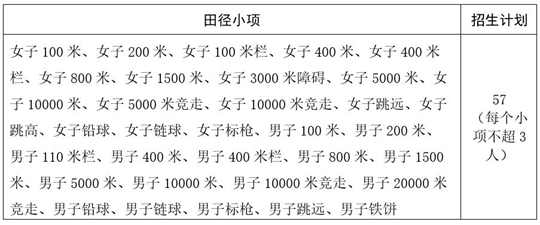 2.田徑項(xiàng)目:按專項(xiàng)考試成績(jī)擇優(yōu)確定合格名單,各項(xiàng)目最多3人。評(píng)分成績(jī)相同考生,同一項(xiàng)目?jī)?nèi)原始成績(jī)優(yōu)者優(yōu)先。不同項(xiàng)目間,本簡(jiǎn)章公布的小項(xiàng)在前者優(yōu)先。