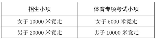 (三)女子10000米競(jìng)走、男子20000米競(jìng)走招生小項(xiàng)與考試小項(xiàng)對(duì)應(yīng)關(guān)系如下表,其余報(bào)考小項(xiàng)與體育專項(xiàng)考試小項(xiàng)一致。