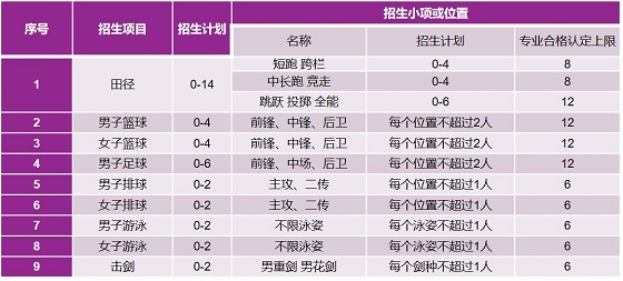 高水平運動隊招生計劃嚴格按照教育部的有關規定執行,各項目計劃錄取人數和認定人數為:
