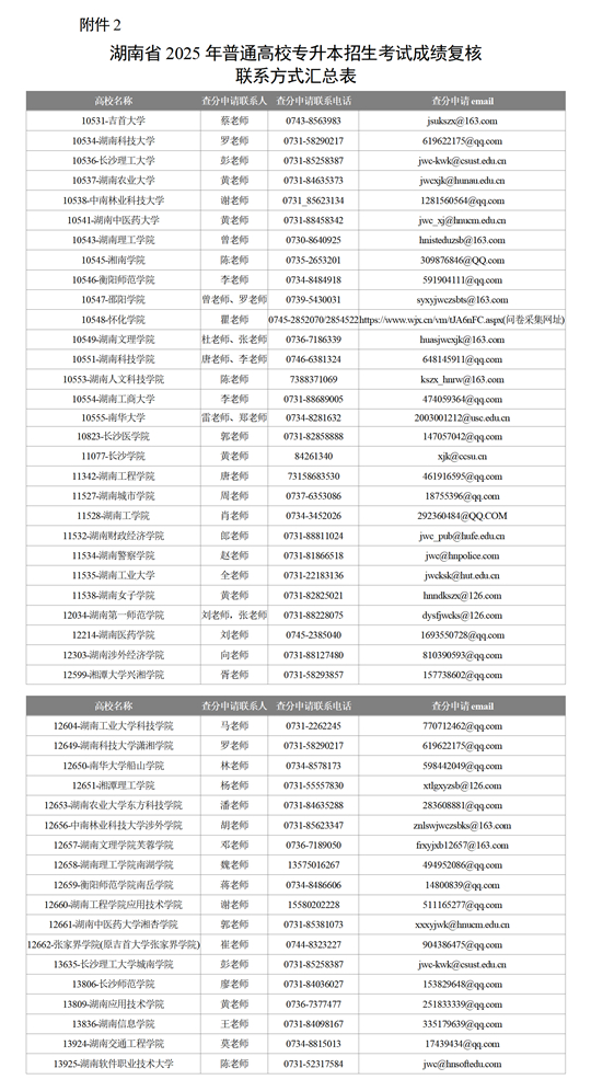 2.湖南省2025年普通高校專升本招生考試成績(jī)復(fù)核聯(lián)系方式匯總表