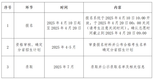 (二)報名方式與材料組織報名時間為2025年4月10日-2025年4月20日。報名系統于2025年4月10日10:00開放,于2025年4月20日00:00關閉(請考生注意關閉時間),確認志愿時間截止到2025年4月20日09:00,未確認志愿的考生報名無效。符合條件的考生,請登錄報名系統(http://gaokao.chsi.com.cn/gxzxbm)填寫并打印《中國政法大學2025年高校專項計劃申請表》,在申請表規定位置簽字、蓋章,按照報名系統要求上傳,并在系統內“附加材料”處上傳下列材料的照片:1.個人自薦信(包括個人經歷及體會、個性特長及取得的成果、進入高校后的努力方向及設想等,需要考生親自書寫,1000字左右);2.身份證照片;3.戶籍證明:戶籍卡或戶口本(首頁、戶主頁、本人及父親或母親或法定監護人所在頁)照片;4.學籍證明:加蓋中學公章的學籍卡照片或中學證明;5.綜合素質評價報告(該項如無法提供,需提交經中學蓋章的說明);6.能反映學生發展經歷和水平的獲獎證書照片等有關材料。缺少《中國政法大學2025年高校專項計劃申請表》及上述1-5項材料視為報名無效。本次報名不需要郵寄紙質材料,不需要提供中學、社會團體和專家個人推薦意見。考生提交的所有報名申請材料必須在中學和班級采取適當形式詳盡公示。
