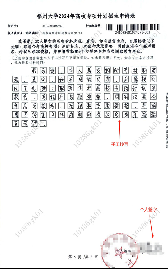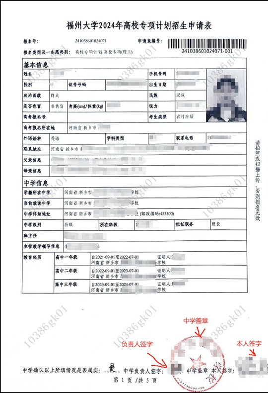 3.《高校專項計劃申請表》:該表通過報名系統打印,第1頁由中學負責人簽字并加蓋學校公章同時需本人簽字,其他頁由考生本人簽字。