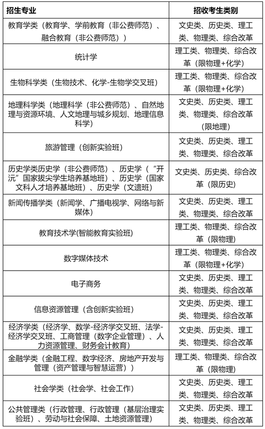 備注:1.非高考綜合改革省份考生在系統(tǒng)報(bào)名時(shí)選擇文史類或理工類;實(shí)行“3+1+2”模式高考綜合改革省份考生選擇歷史類或物理類;實(shí)行“3+3”模式高考綜合改革省份考生在系統(tǒng)報(bào)名時(shí)選擇綜合改革類;在高考填報(bào)志愿時(shí)再填報(bào)具體專業(yè)(類)。2.我校最終在各省(市、區(qū))的招生專業(yè)以教育部批準(zhǔn)的2025年分省分專業(yè)招生來(lái)源計(jì)劃為準(zhǔn)。3.我校高校專項(xiàng)計(jì)劃不招收新疆雙語(yǔ)類考生。