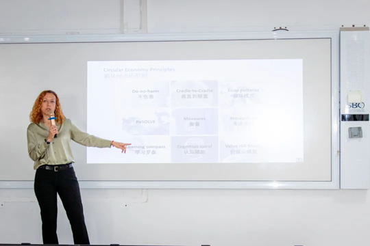 為深化師生對可持續(xù)發(fā)展與循環(huán)經(jīng)濟的理解,克里斯蒂安老師邀請上海可持續(xù)發(fā)展企業(yè)的顧問丹妮拉(Daniela Essenpreis)開展專題講座。丹妮拉系統(tǒng)地比較了傳統(tǒng)線性經(jīng)濟的“資源—產(chǎn)品—污染排放”模式與循環(huán)經(jīng)濟的“資源—產(chǎn)品—再生資源”模式的本質(zhì)區(qū)別,指出這一轉(zhuǎn)變不僅是生產(chǎn)方式的革新,更是思維理念的升級。她向同學(xué)們介紹了生命周期清單(LCI)工具,深入解析了產(chǎn)品或服務(wù)在整個生命周期對環(huán)境的潛在影響。同時,丹妮拉借助豐富的案例,生動闡釋了循環(huán)經(jīng)濟對企業(yè)實現(xiàn)“凈零”目標的重要意義,以及企業(yè)踐行循環(huán)經(jīng)濟模式的必要性與效益。