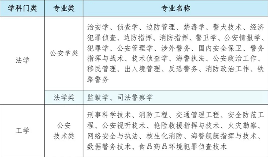 教育部《普通高等學校本科專業目錄》(2023版)(以下簡稱“目錄”)中,與警察最為相關的就是法學門類的公安學類和工學門類的公安技術類相關專業(見下表)。同時,法學類的監獄學、司法警察學專業畢業后也可以成為警察。