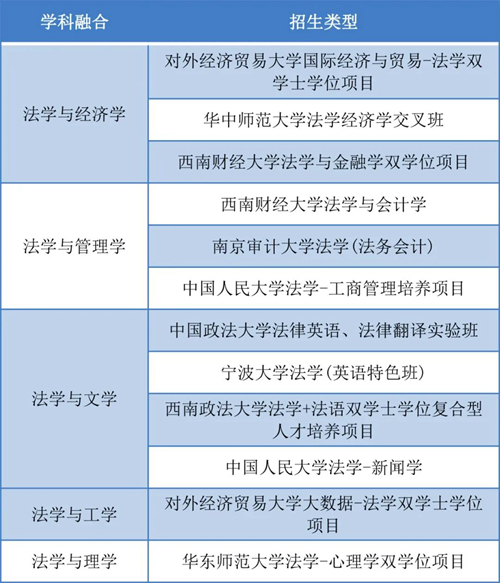 法學適用面廣,與其他學科交融互通形成交叉培養機制,可以提升學生的綜合素養,拓寬知識廣度。因此,法學類專業常與其他學科形成雙學士交叉型、復合型培養模式。以下列舉法學與其他學科融合情況和對應的招生類型。